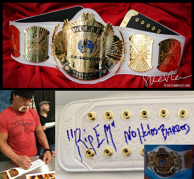 Leather crafted by Mike Nicolau. This project was inspired by the belt from "No Holds Barred" starring Hulk Hogan (pictured below signing this belt).